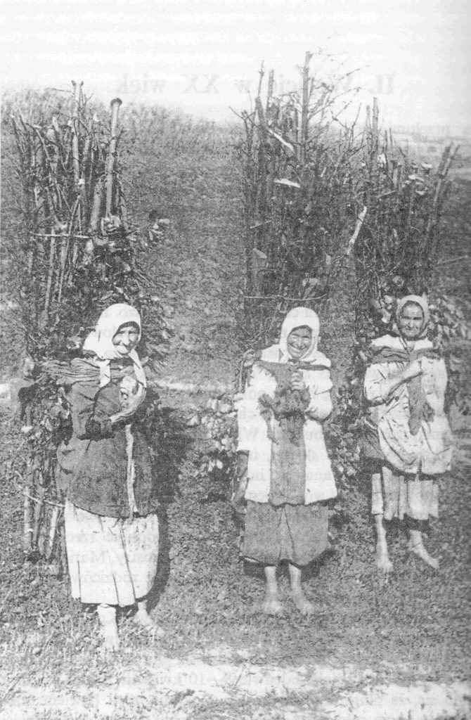 Na fotografii widzimy trzy, skromnie ubrane kobiety, z chustami na głowie. Każda z nich niesie na plecach duży pęk chrustu, czyli suchych gałęzi i patyków zebranych w lesie. Wiązki zostały starannie powiązane sznurem i przytrzymywane starymi tkaninami. Ich odzież to długie spódnice i sięgające bioder stare jakle. Wszystkie stoją boso. Środkowa kobieta, uśmiecha się delikatnie w stronę fotografa, podczas gdy pozostałe dwie mają poważniejsze twarze. Tło jest mało wyraźne – fotograf skupił się na postaciach – co uniemożliwia dokładniejszą lokalizację zdjęcia.
