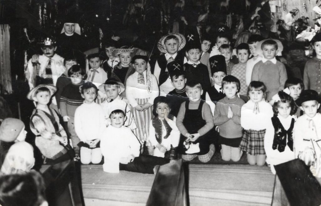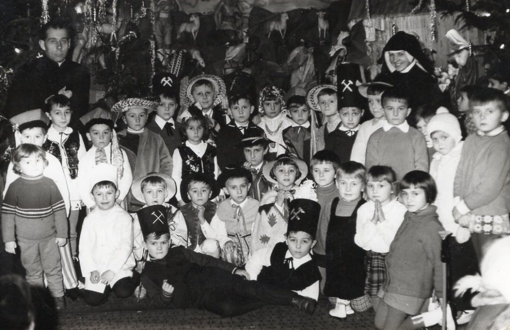 Fotografie z jasełek dziecięcych z początku lat 70. XX wieku, wykonane w Kozach, w parafii św. Szymona i Judy Tadeusza. To nie tylko pamiątka z przedstawienia bożonarodzeniowego, lecz także zbiorowy portret dzieciństwa lokalnej wspólnoty – silnie osadzonej w tradycji i religii. Dzieci na zdjęciu są poważne i skupione; brakuje uśmiechów, niektóre mają dłonie złożone w geście modlitewnym. Nie powinno to dziwić – w tamtym czasie dzieci uczono, że jasełka są przede wszystkim wydarzeniem religijnym, a nie zabawą.