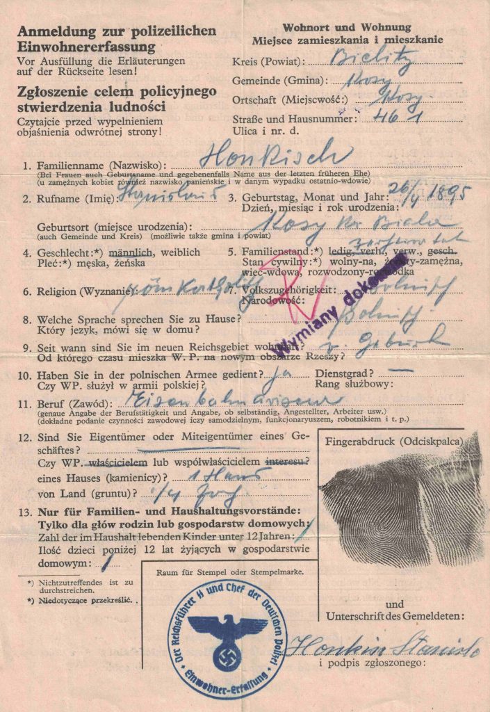 Dokument meldunkowy dla Stanisława Honkisza (Stanislaus Honkisch)