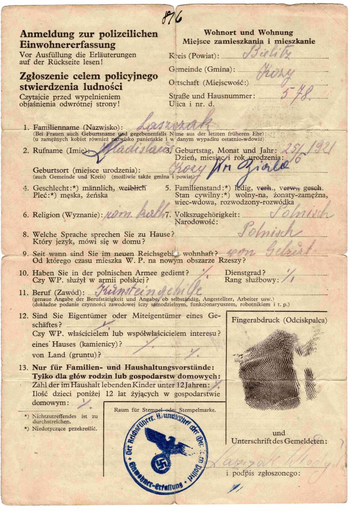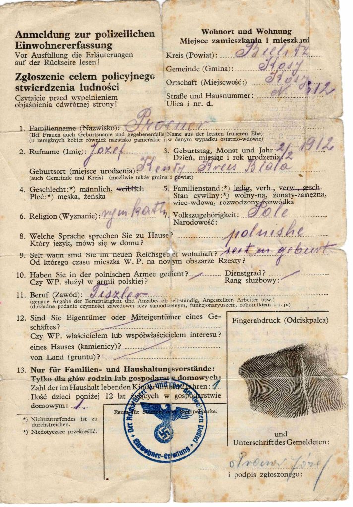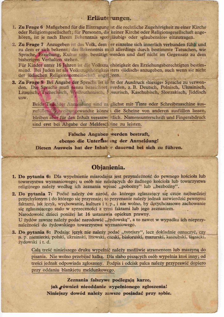 Przed wypełnieniem zgłoszenia obowiązywało zapoznanie się z objaśnieniami na odwrocie Czytajcie przed wypelnieniem objaśnienia odwrótnej strony! W objaśnieniach pogrubioną czcionką informowano, że Zeznania fałszywe podlegają karze, jak również nieoddanie wypełnionego zgłoszenia! Oprócz typowych pytań dotyczący danych osobowych w formularzu znalazły się zagadnienia związane z narodowością czy używanym w domu językiem. Był uwierzytelniany odciskiem palca oraz własnoręcznym podpisem. Dodatkowo opatrzony był odciskiem pieczęci “Der Reichsführer SS und Chef der Deutschen Polizei/ Einwohner-Erfassung”. Zgodnie z prawem należało go zawsze nosić przy sobie.
